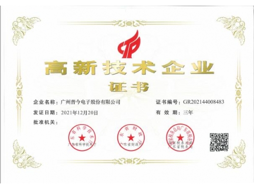 最近、Guangzhou Pujin Electronics Co.Ltd.は、広東省科学技術局、広東省財務局、広東省税務局が共同で発行した「ハイテク企業」認定の再審査に合格しました。